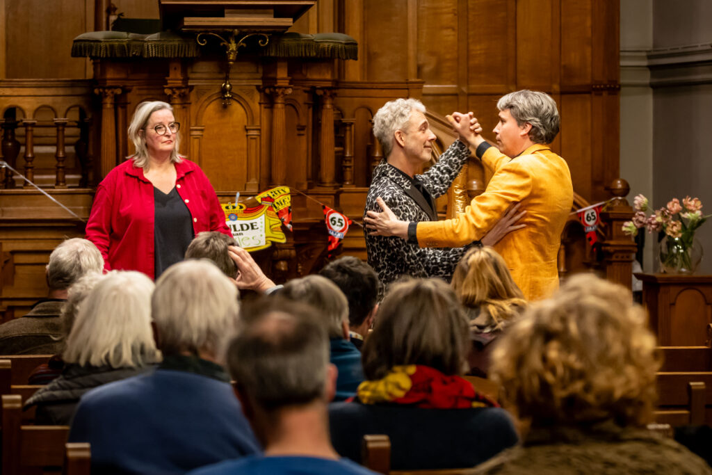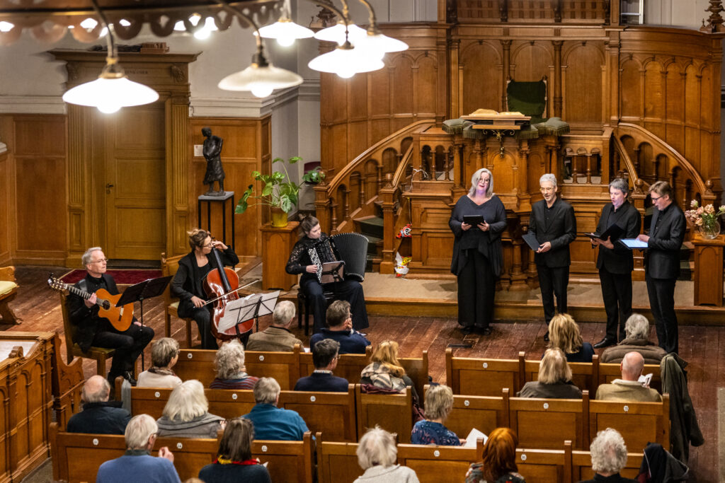 Een behoorlijk ronkende tekst voor in een subsidieaanvraag. Maar de commissie vond het prachtig! Het dekte in ieder geval zeker de lading van wat we hebben gedaan in de concerten rondom Valentijnsdag. Vier zangers werden begeleid door cello, gitaar en accordeon, een verrassende combinatie die heel goed uitpakte. We zongen een gloednieuwe en hilarische compositie van René Veen op teksten uit het kookboek “Het Fornuis van Venus” uit 1936, waarbij in Zwolle de Horecamannen zorgden voor een lustopwekkend hapje uit dit kookboek. Heerlijk! Verder werd Robert Longs meezinger Iedereen doet het voor ons gearrangeerd door Jetse Bremer. Het publiek zong daadwerkelijk mee!